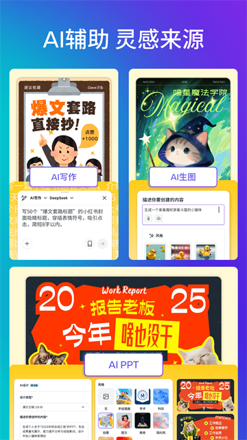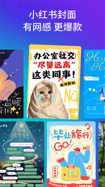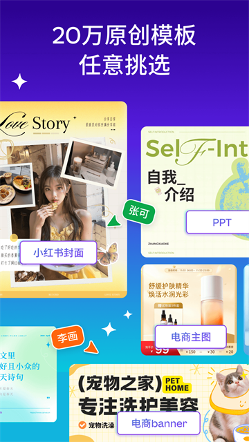 1、「无限可能」:20W+原创模板,1亿+素材,5000+字体,从微信公众号图文、小红书图文、小说封面、商品宣传图、海报设计,到PPT制作、简历、Logo…各类设计模板应有尽有,满足生活、工作等多场景做图需求