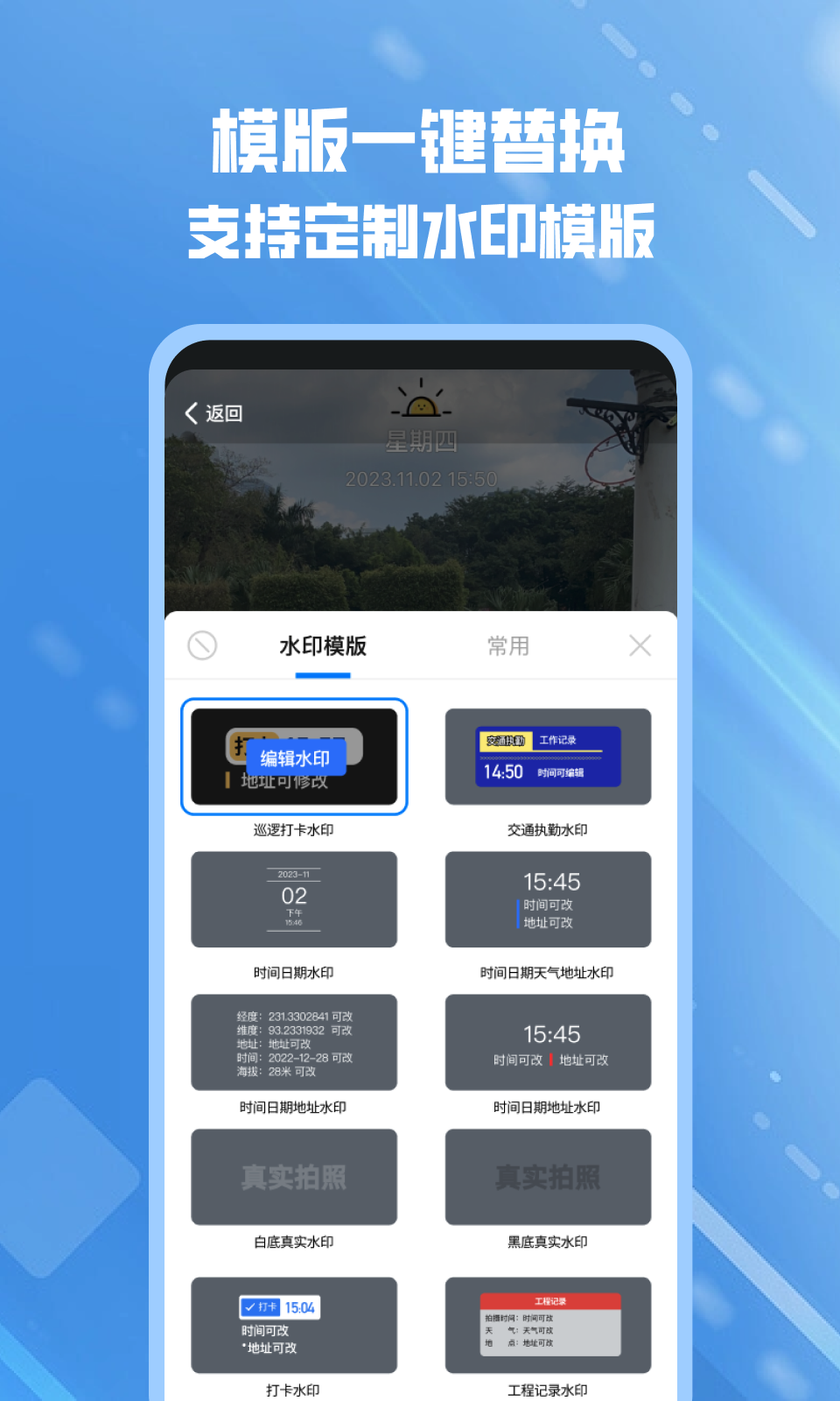 2、拍摄完成或导入图片后,选择水印编辑功能,可以自由添加或去除水印内容。