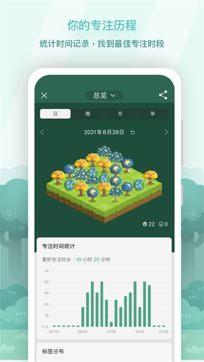 1.支持用户进行历史回顾,可以查看一年内用户的专注次数,每一个树都是一次专注过程。