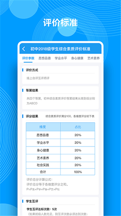 1.学期末档案管理:包含思想品德、学业水平、身心健康、艺术素养等评价维度,支持学业成绩、体测结果、自评互评、档案公示等内容展示。