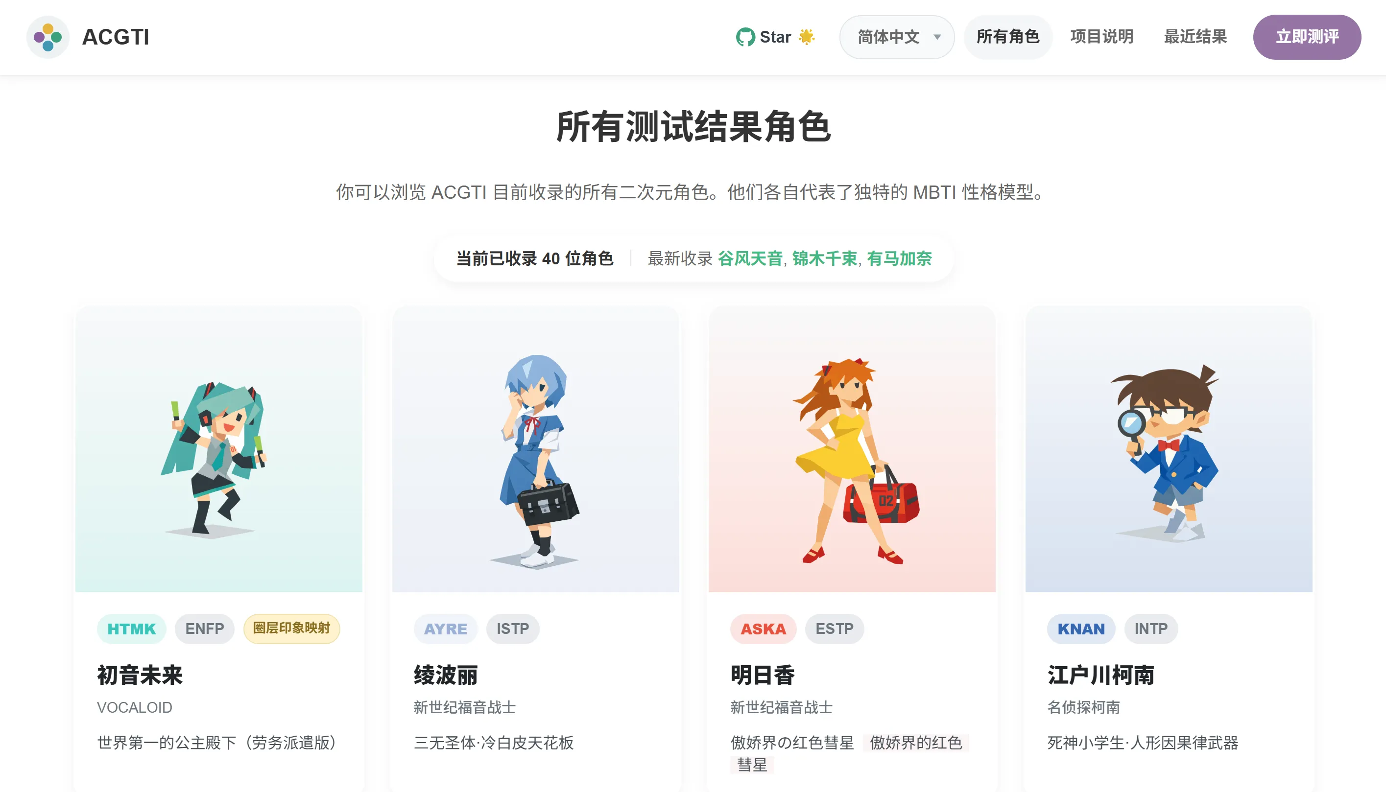 ACGTI二次元人格测试是依托MBTI体系打造的趣味性格分析工具,通过场景化答题为你匹配专属二次元角色原型。应用收录42位高人气动漫角色,让测试结果更有沉浸感与趣味性。支持一键生成专属分享海报,便捷展示你的个性人格标签。想知晓自己的二次元角色定位,就下载ACGTI二次元人格测试手机版体验。