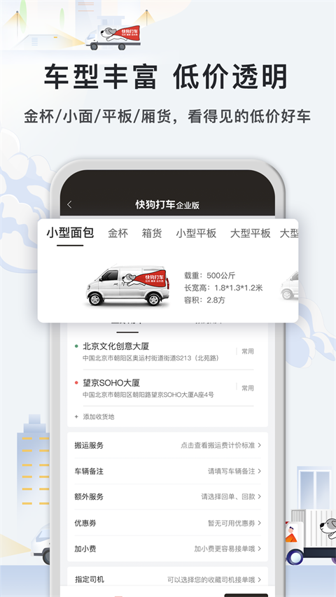 满足立即用车、预约用车、临时性用车、计划性用车,定制化用车等多种货运用车需求。提供搬运、装卸、带回单、多点运输、收藏司机、在途监控等个性化需求。