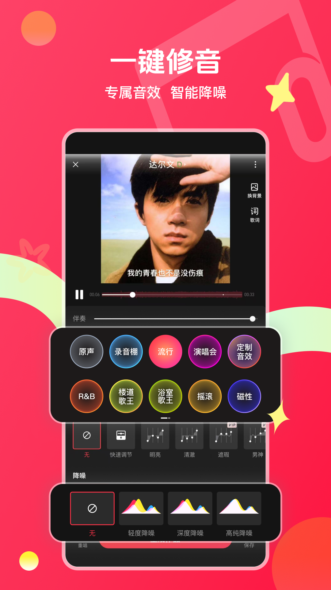 3、具备强大的“一键修音”功能,可优化音质让歌声更动听;同时支持短视频、MV模式及视频合唱,为用户提供多种演绎歌曲的方式。