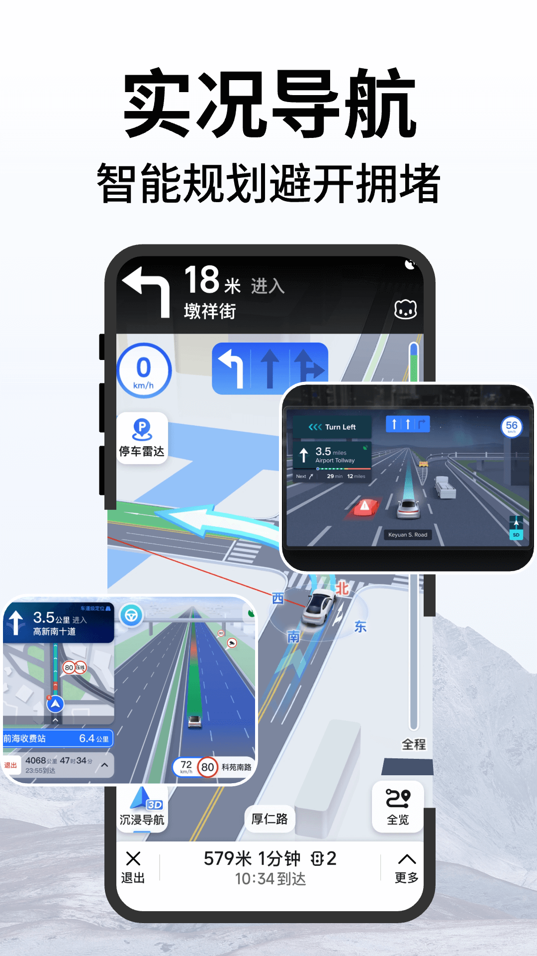 3.提供精准的车道级指引,在高速岔路口、环岛、高架出入口等复杂路段,清晰提示行驶车道