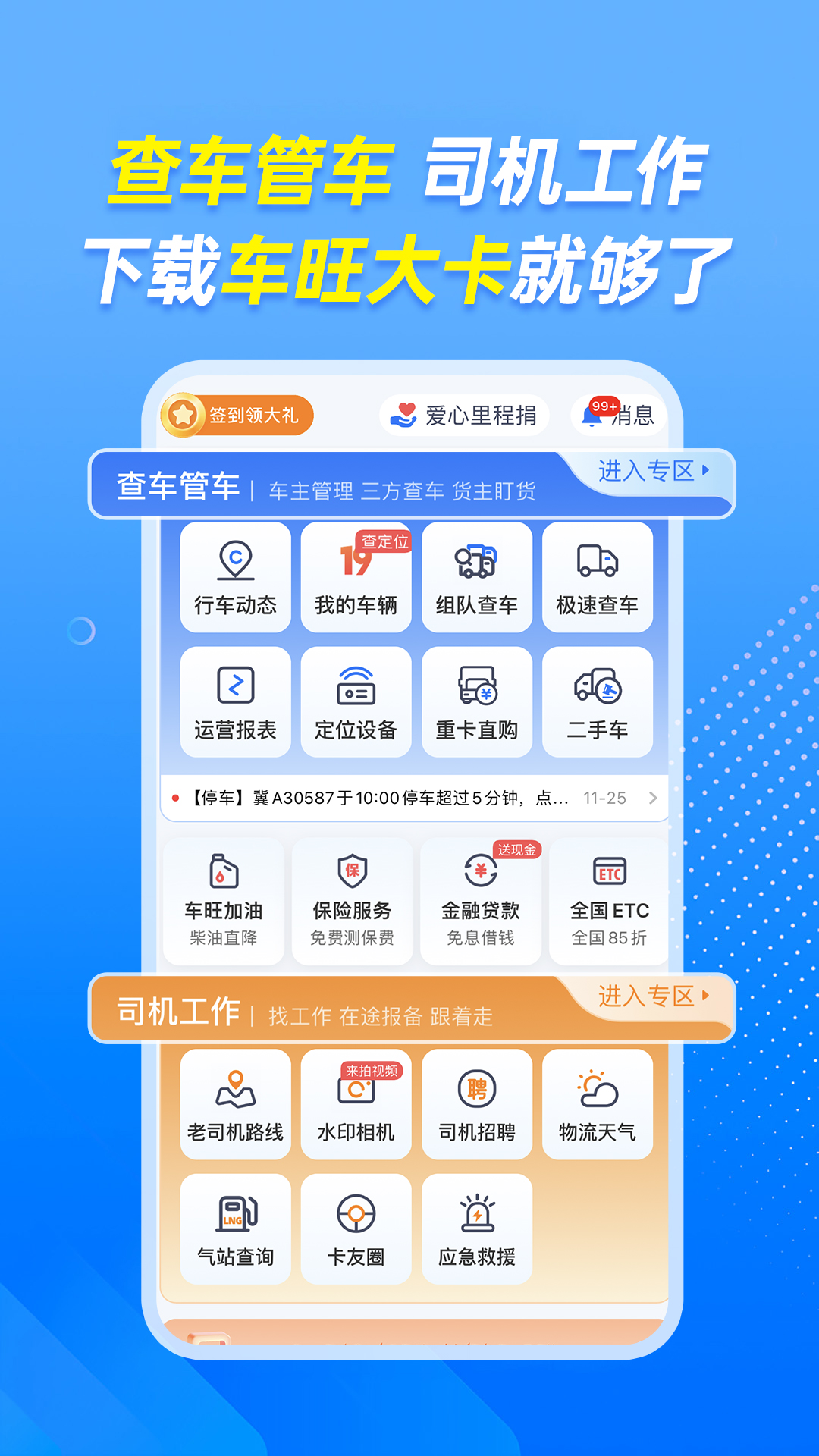 车旺大卡app是跑货运的卡友必装的软件,这里会有很多老板有送货用车的需求,货车师傅们可以借助这个平台快速接单,当然如果你是老板的话,也可以在这里发布用车招聘启示。本软件可以定位,可以实时查看运行轨迹,还有加油优惠活动,修车纹路,违章处理等等,都可以使用。