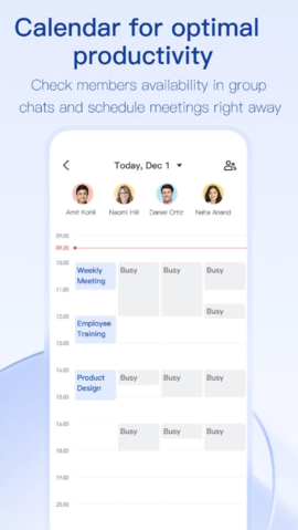 1.创建会议时可添加辅助时区,一键查看参会人的忙闲状态,精准匹配跨地域团队的可参会时间。