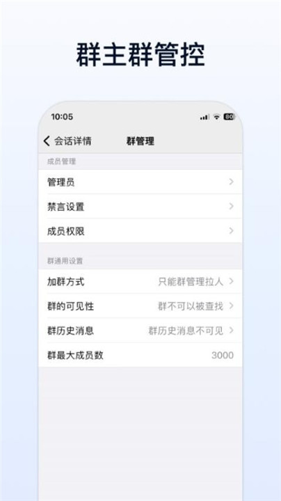 1、群聊控制:支持群成员添加、语音管理、强制撤回消息等群组权限管理功能。