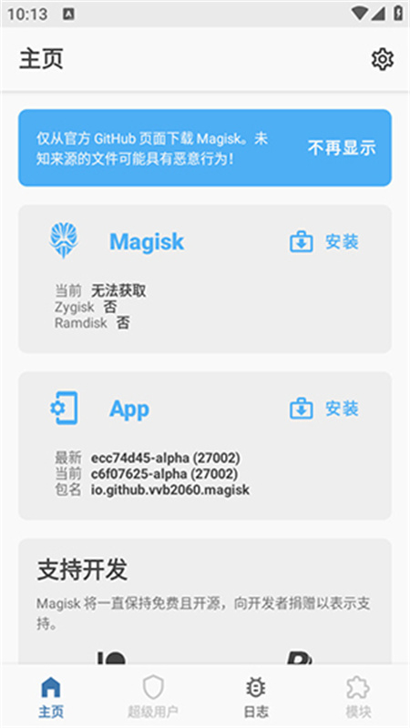 有些小白忘性大,设置里“隐藏Magisk应用”改了面具名称,第二天都忘了自己的面具版本。而且这种情况并不罕见,所以依靠“图标为脸谱、应用名称为Magisk”这个判断方法有一定的局限性。所以接下来,我教大家通过面具主页来判断面具版本。以下图一的面具主页均是官方面具的,从左往右依次是官方稳定版、金丝雀(Canary)版、调试(Debug)版。