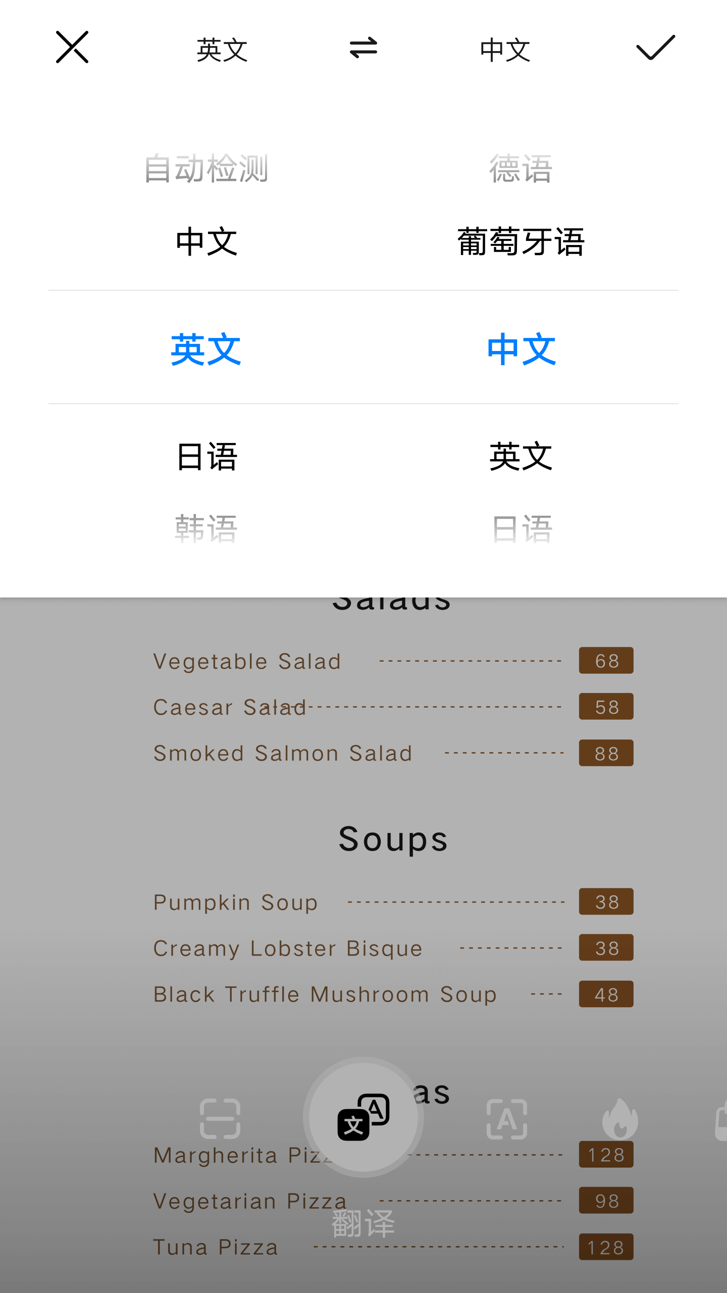 1. 进入功能页面后选择“翻译”模式,提前设置好识别语言和目标翻译语言。