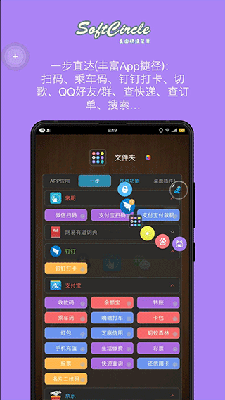 悬浮捷径SoftCircle是免费的手机桌面管理工具,可以快速的让用户自定义需要的软件,打开便捷的悬浮窗功能,比如你可以设计微信的小程序,然后通过悬浮窗的调用,可以直接在手机主界面一键直达小程序窗口,当然啦,它能开启的软件远不止这一个,其他功能期待用户陆续探索。