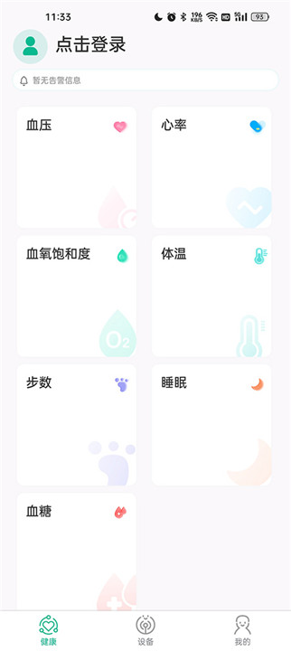 基础指标:实时显示血压、心率、血氧饱和度、体温、步数等数据。