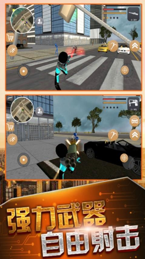 1、玩家要操控小火柴人在繁华都市里飞檐走壁,像蜘蛛侠一样穿梭在高楼大厦间。