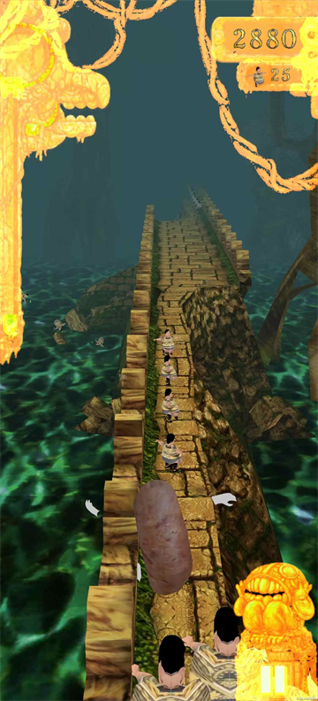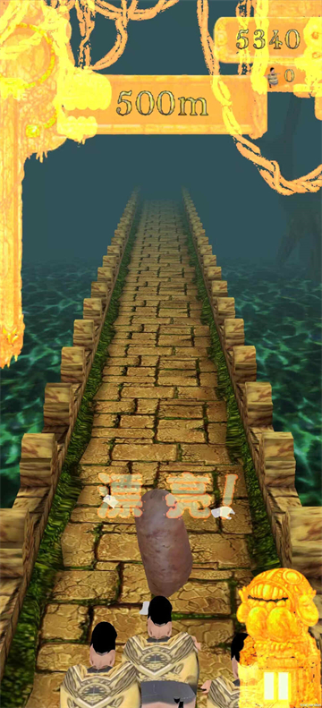 1、本游戏延续神庙逃亡游戏的经典玩法,玩家控制焖子躲避陷阱,尽可能跑得更远。