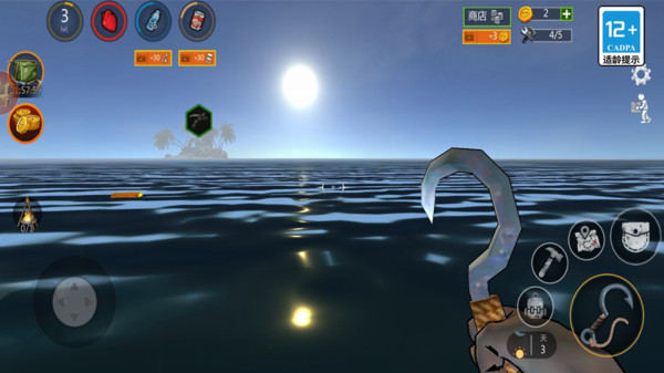 钩子收集:右键瞄准、左键发射钩子,拖拽海面漂浮物(木板 / 塑料 / 棕榈叶 / 木桶)至木筏;