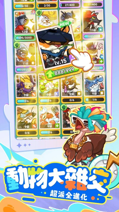 3、【动物大杂交,超派全进化】百种超派兽兽乱斗开打!呆萌变异卡皮胖达、肌肉爆击老狮基…搞怪进化路线每次都有惊喜!