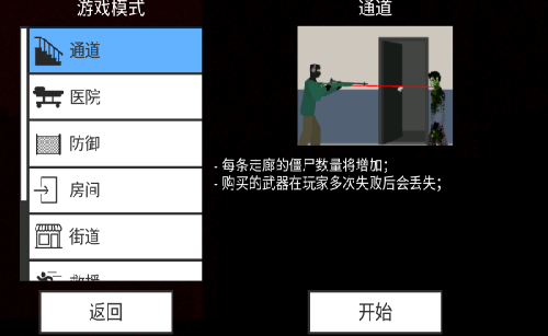 2、游戏模式分为通道、医院、防御、房间、街道和救援等,到处都是僵尸。