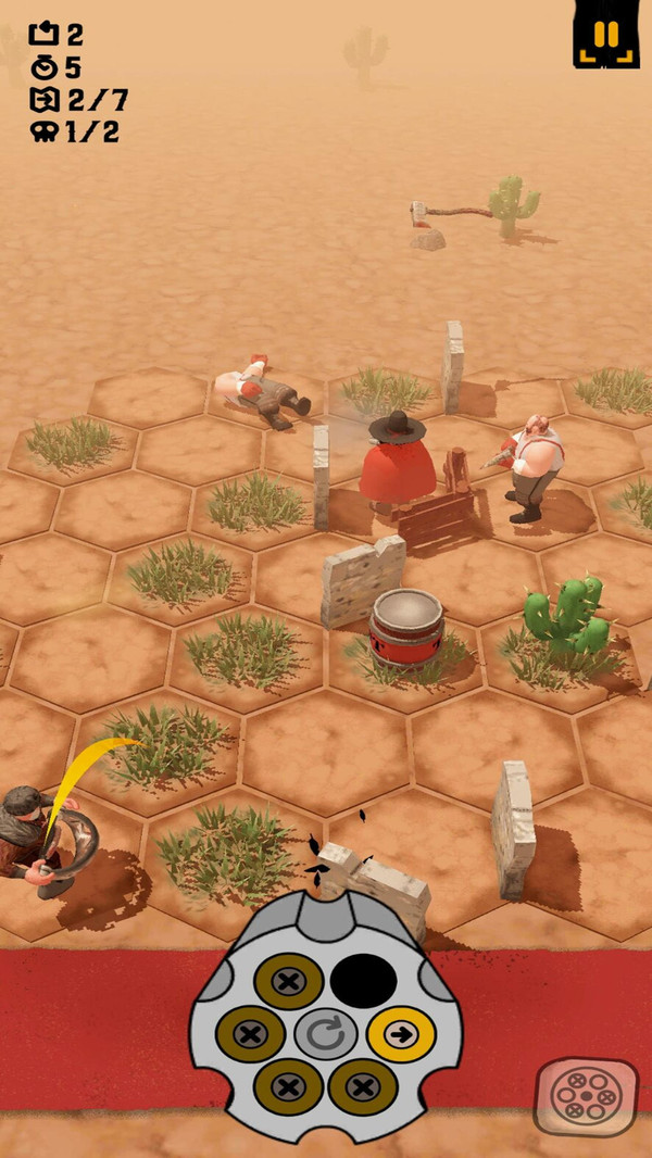 1、游戏专注于还原西部片中紧张刺激对决体验,核心玩法围绕快速拔枪、精准射击和利用掩体周旋展开。