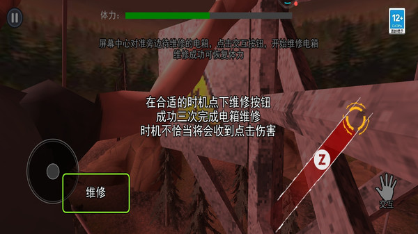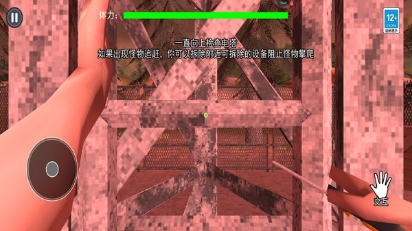 移动与攀爬:虚拟摇杆 / 手柄控制移动,沿铁架、梯子向上攀爬,避开断裂平台、锈蚀阶梯,防止坠落;电塔结构随机生成,需实时调整路线。