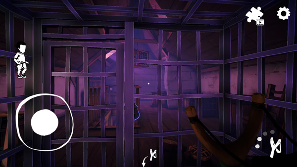 3.操控虚拟摇杆走出铁笼,优先探索周边区域的基础道具,为后续解谜做好准备。