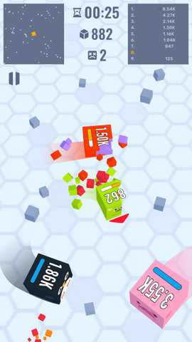 核心玩法围绕“以小博大”展开,通过不断收集场上的小型方块,玩家角色会实时发生体型变化,这种直观的实力增长带来了极强的反馈感与策略深度。