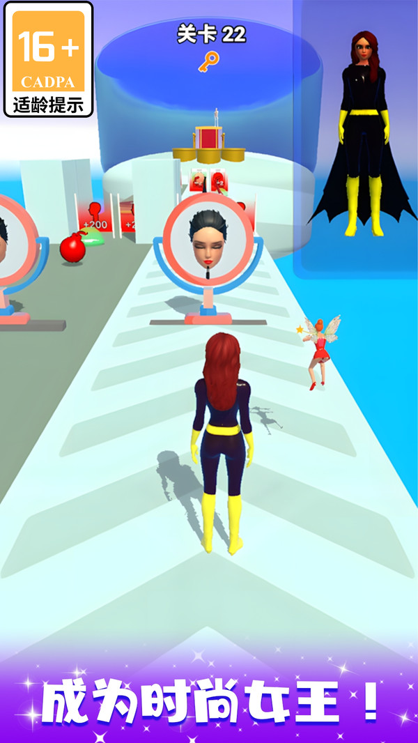 1、滑动屏幕切换赛道,拾取服饰、发型等道具完成造型匹配。