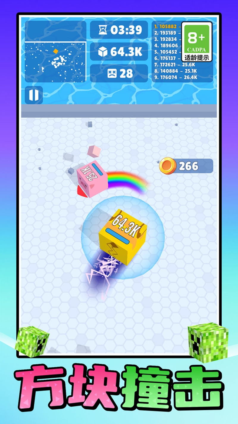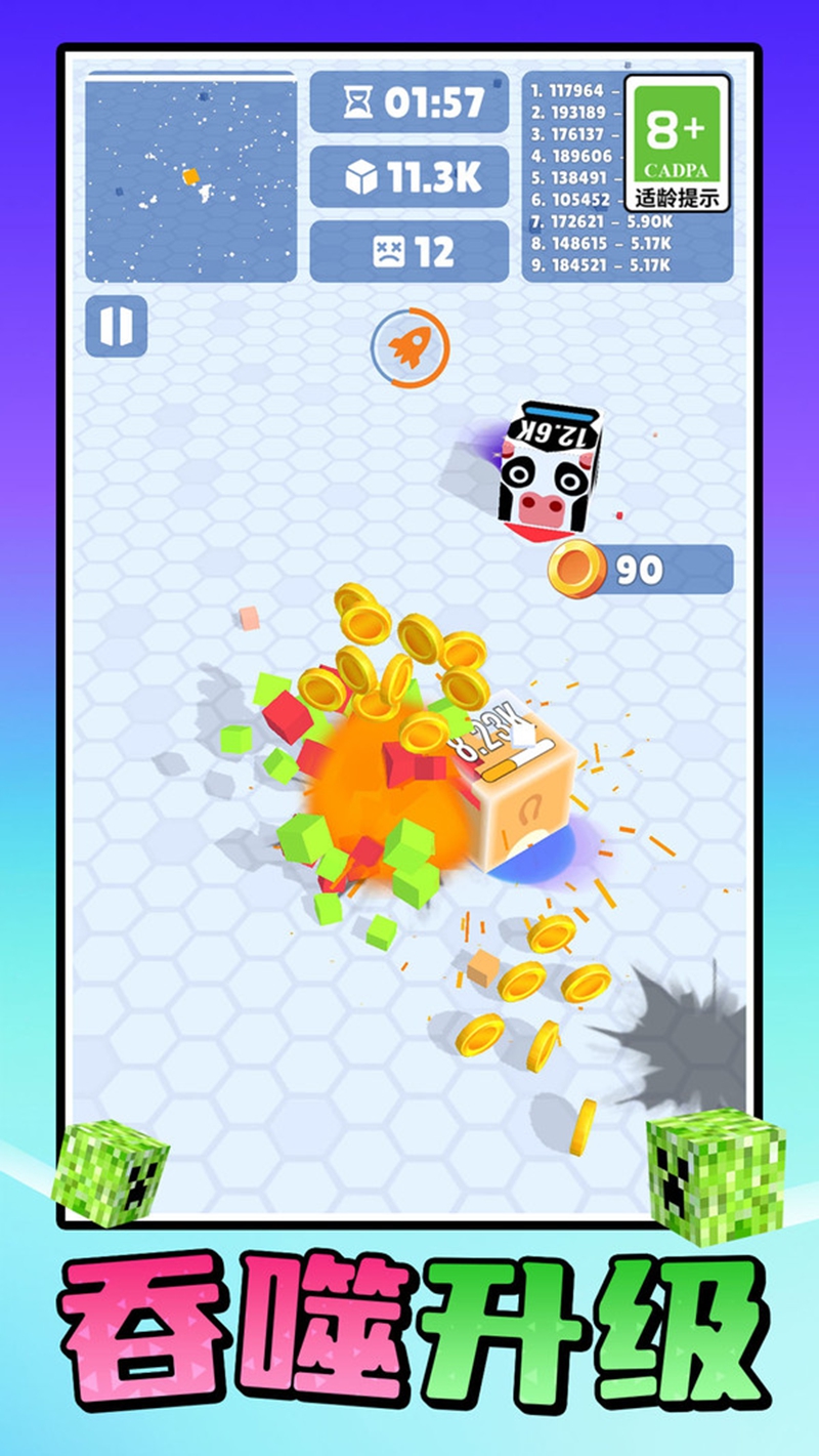 2、吞噬方块后获得金币,可在局外解锁新皮肤与强化被动技能。