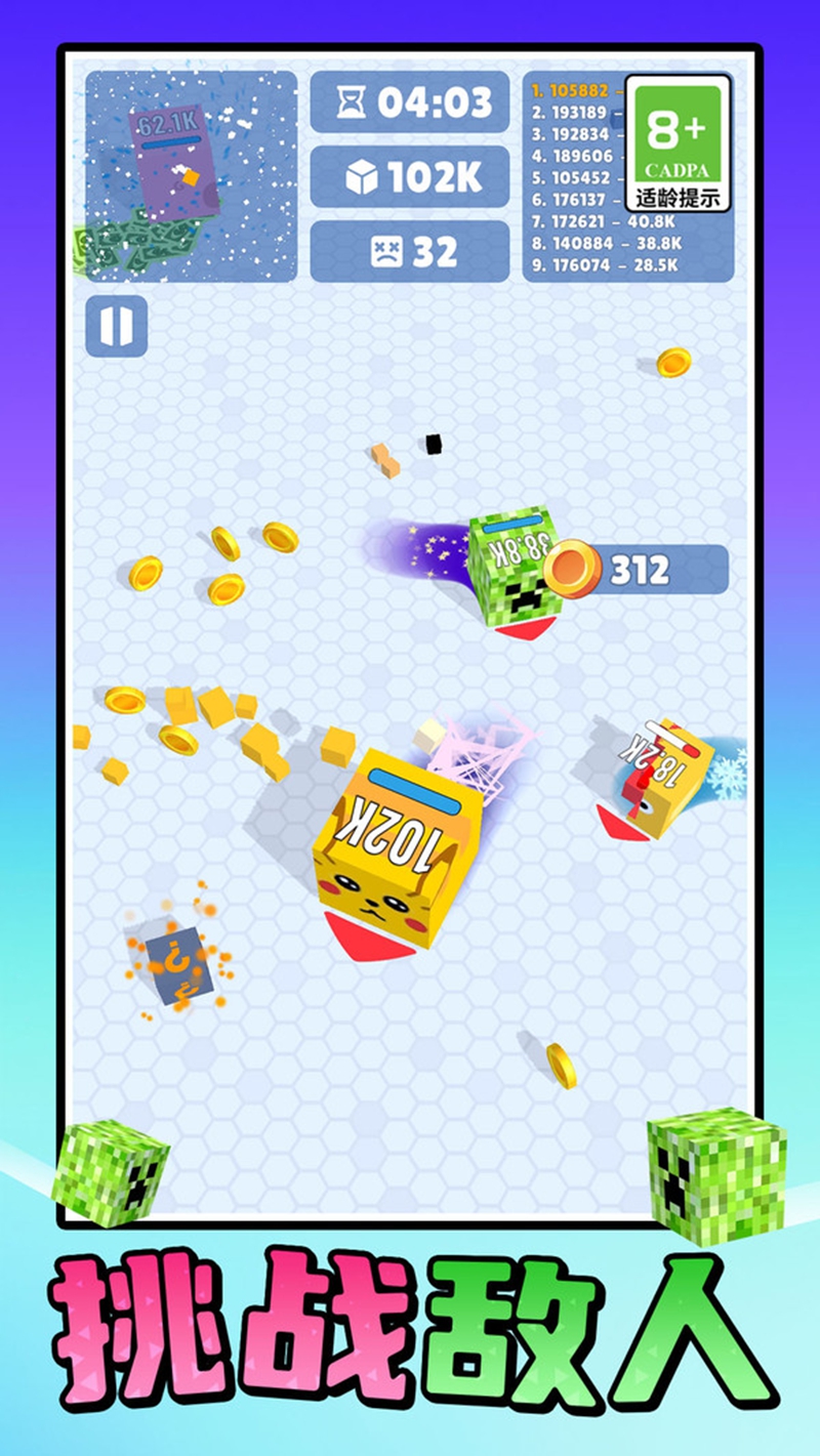 1、滑动屏幕操控方块移动,撞击并吞噬数值低于自身的目标。