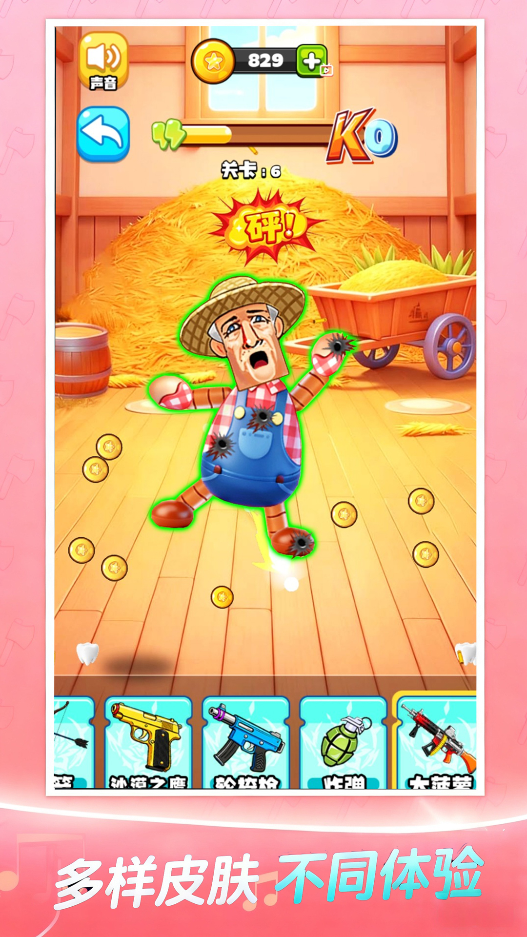 2、每次有效击中都会产生金币奖励,用于在商店中解锁新武器,如铁锤、火焰喷射器或链锯等。