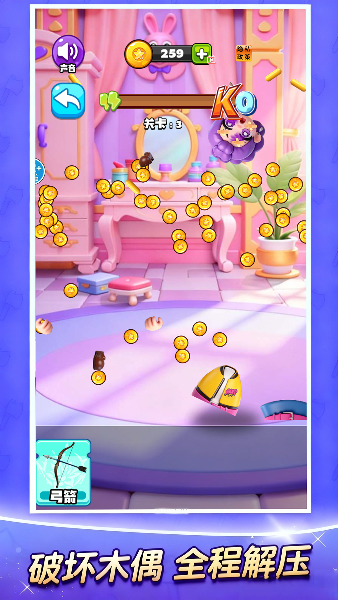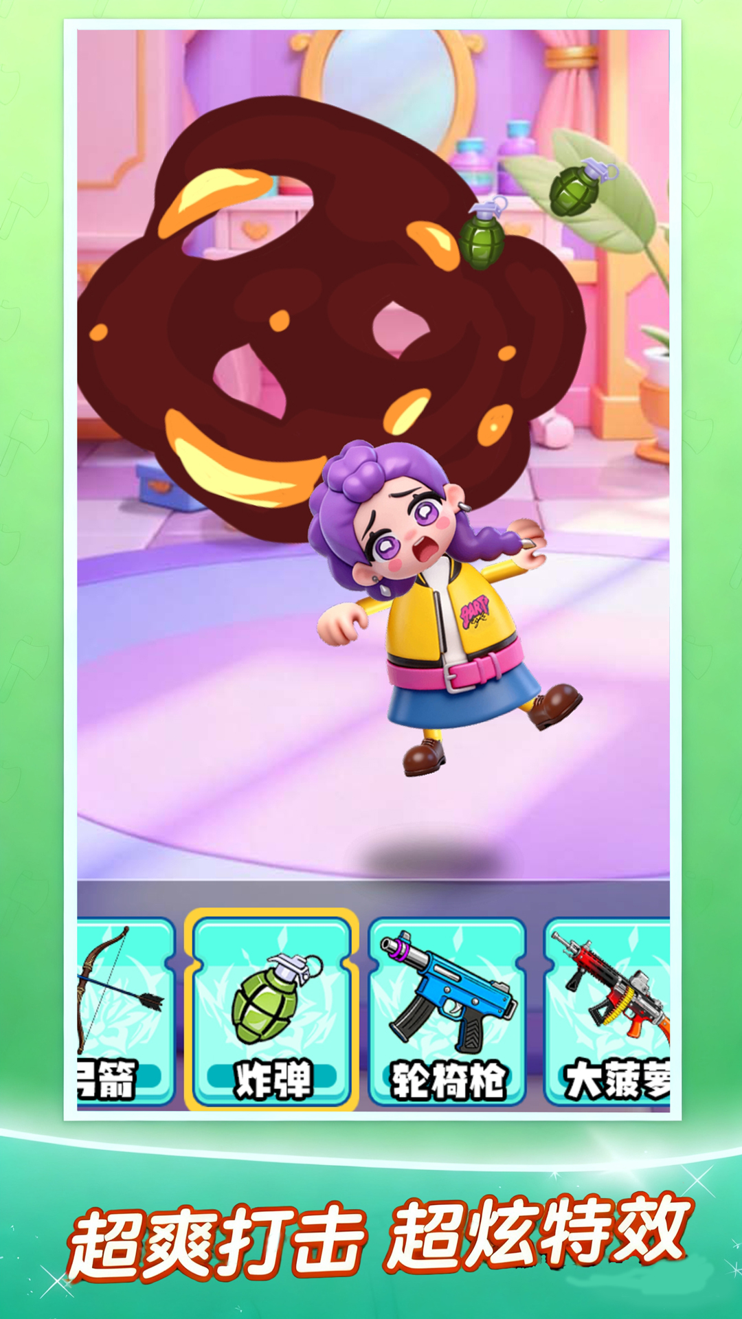 3、武器系统按破坏强度分级,初期提供基础工具,后续可通过金币逐步解锁更具视觉冲击力的顶级装备。