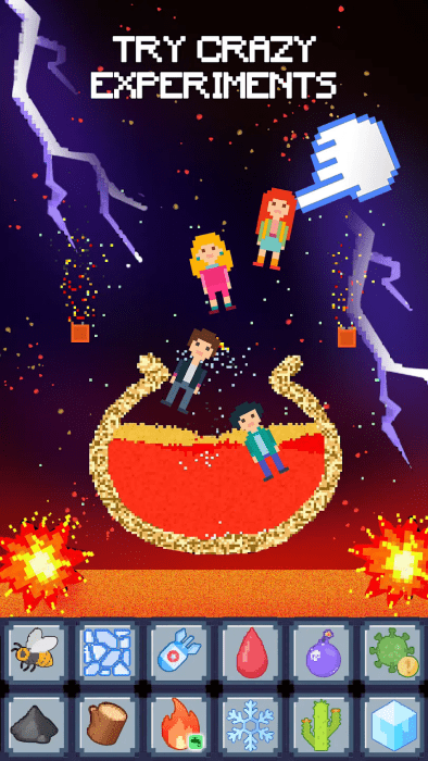 3、多样元素组合:游戏中包含水、火、沙、石头等各种粉元素。玩家可以自由组合这些元素,观察它们的相互作用和奇妙反应。