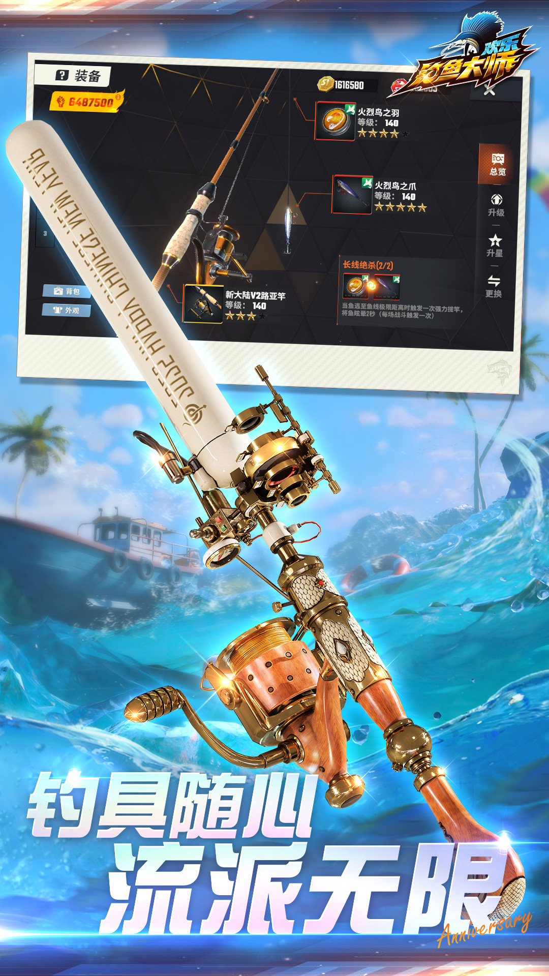鱼卡提升重量 / 伤害 / 分数,优先升级卡包送的卡;勋章强化提升钓技,执照等级达 SSS/X 等拿限定奖励(如鱼竿皮肤)。