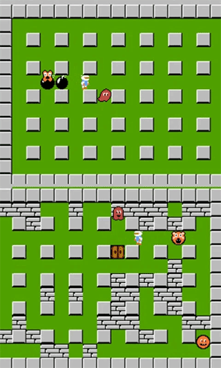 5、怪物全部清除之后,需要将墙炸掉,找大门,在找门的过程中可以获得道具,道具位置随机,每关只有一个,种类有加强火力,增加炸掉个数,遥控炸掉,增加移动速度,还有放炸衣。