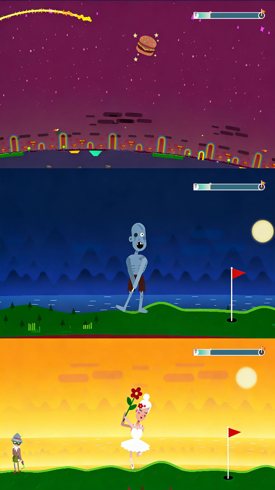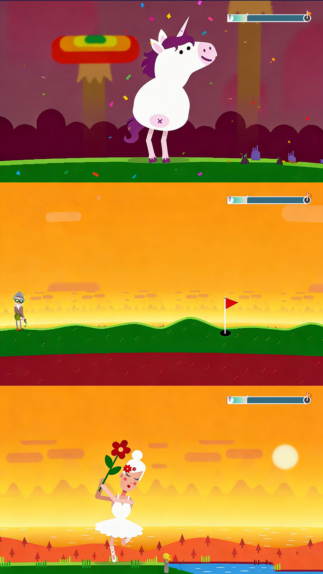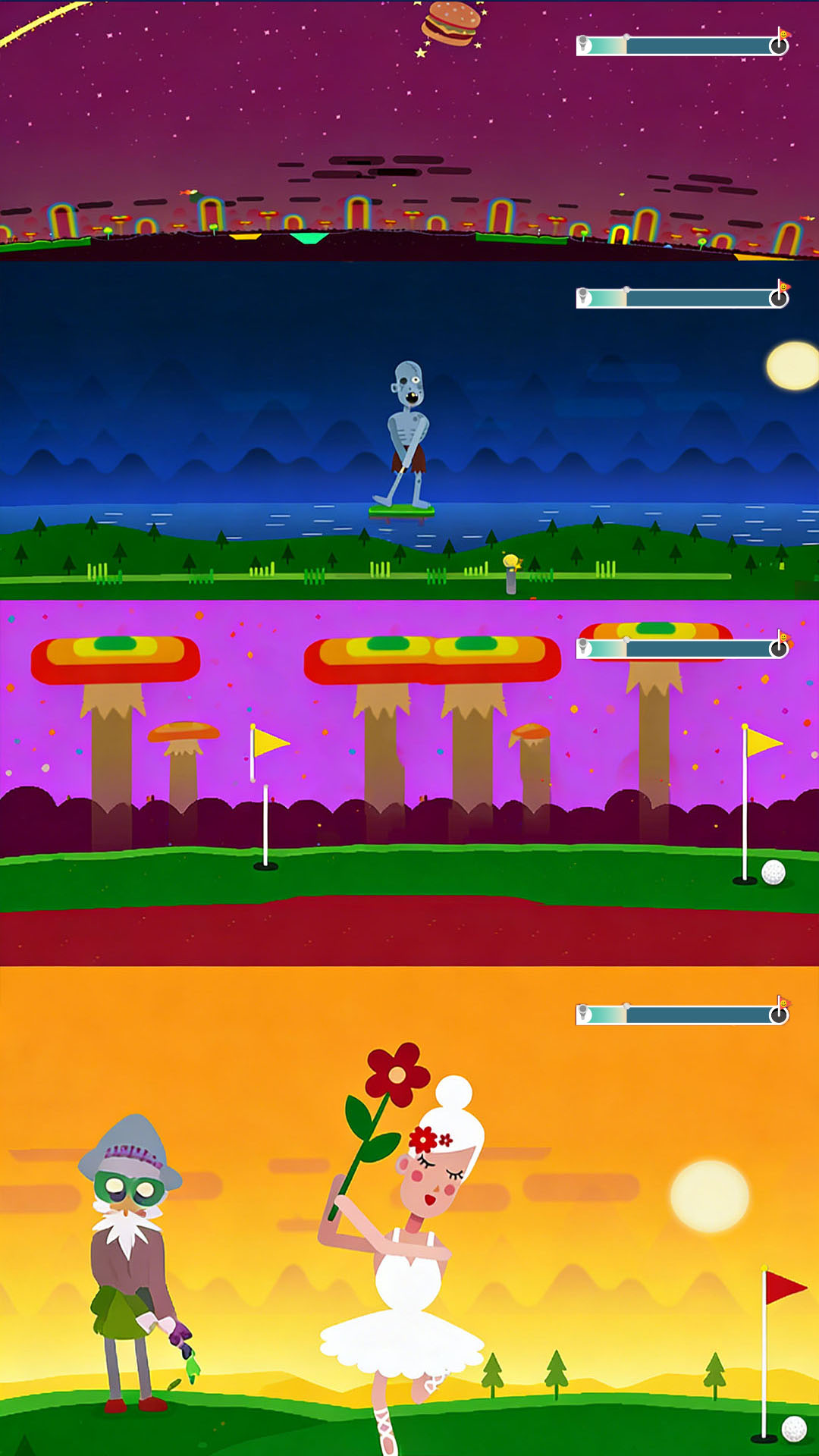 4、让高尔夫球飞行距离最大化,无需固定落点,专注于借助各类互动元素延长飞行轨迹,追求更远成绩。