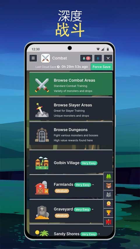 战斗机制:采用回合制战斗,玩家通过装备武器、护甲和食物进行战斗,武器和护甲提供各种战斗状态的加成和减益,食物用于治疗。
