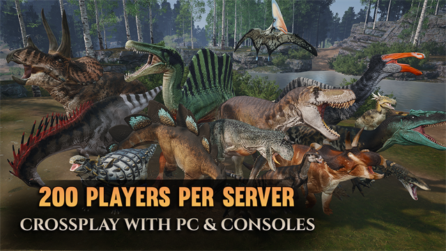 每台服务器最多可容纳200名玩家,危险总是在附近。与任何人一起玩跨平台游戏,无论他们的游戏设备如何!加入一个小组以提高你的生存机会。或者,加入由数十名其他玩家组成的部落,一起聊天并协调你的下一次大冒险。