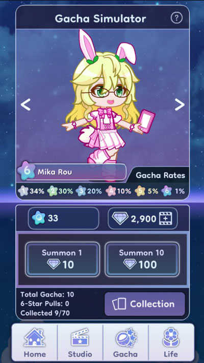 进入 “Gacha”,消耗宝石抽取 1-6 星道具,包括服装、饰品、武器、宠物等 100 多种。