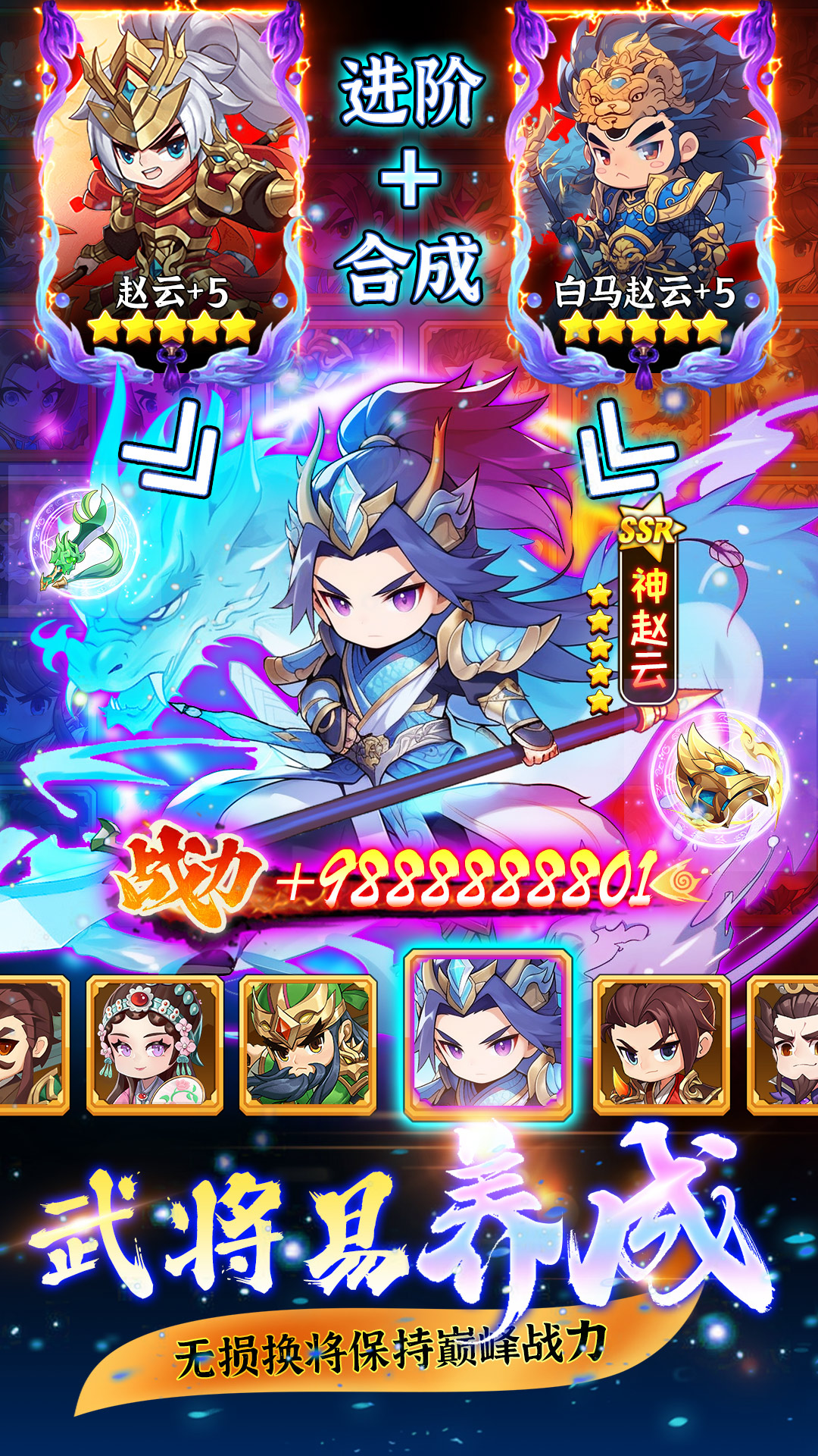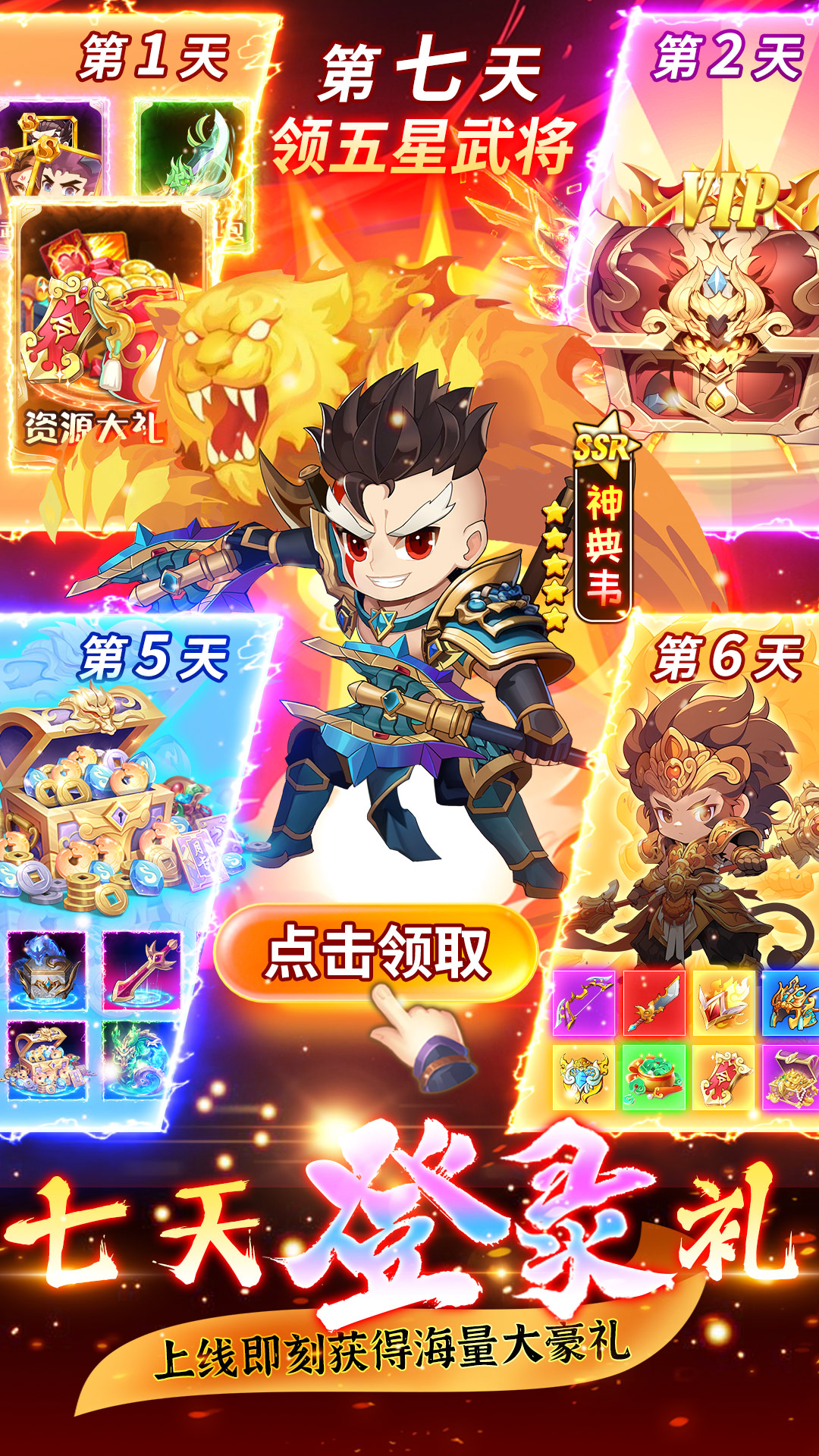资源稳定获取:七日登录送五星名将,推关可得核心武将(如赵云),版本活动福利丰厚,登录即享 VIP6 特权与千抽自选,大幅降低养成门槛。