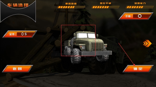 2、在车辆选择界面挑选合适的油罐车型号,点击确定确认选择,准备执行山地行驶任务。