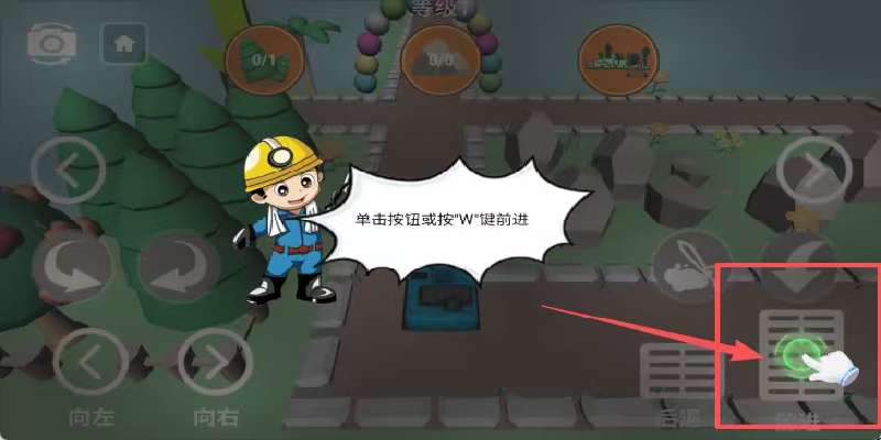 3、中央戴安全帽小人对话气泡提示单击按钮或按W键前进,右侧红框绿圈指针指向前进按钮,按提示操作可控制角色向前移动。