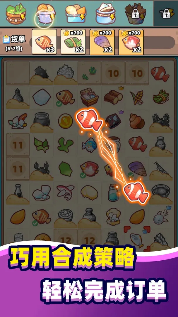 2、点击查看货单,开始前往海上捕鱼,根据海图记录寻找需要的原材料,相同的鱼类合成升级。