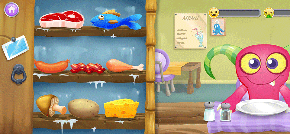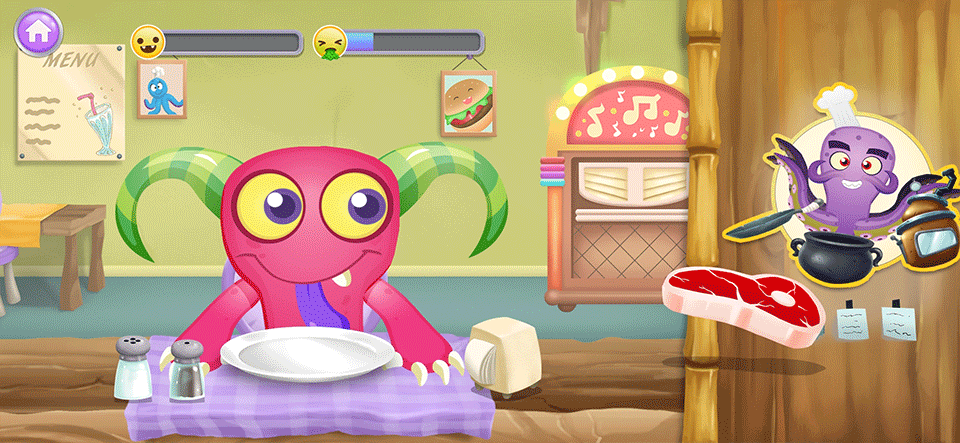 顾客到店后,将烹饪好的菜品递给顾客,观察满意度进度条,进度条满时顾客会给出好评并支付金币,差评会影响旅馆声望。