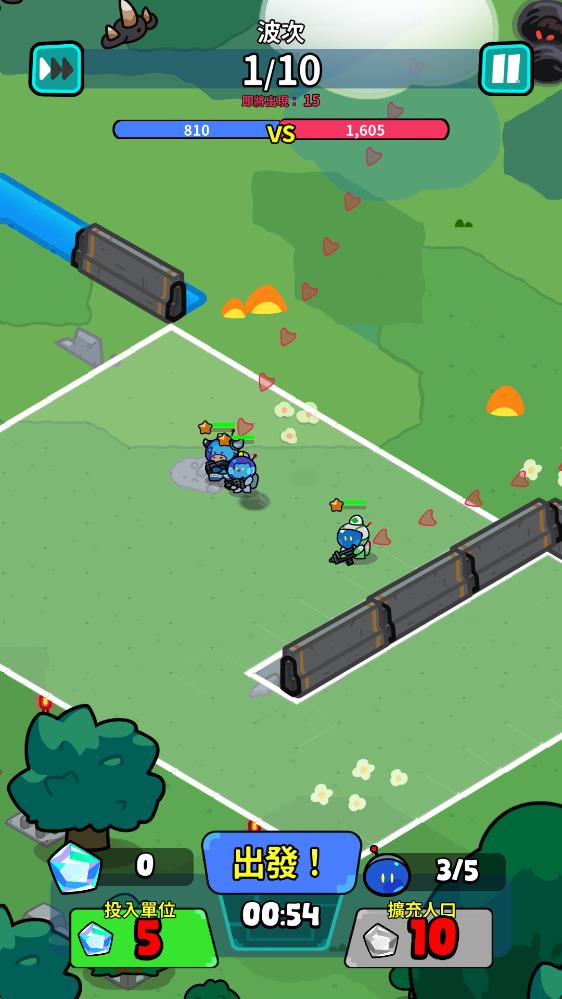 3、放好小兵后点击出发按钮来开始闯关,点击出发后小兵会自动攻击出现的敌人。