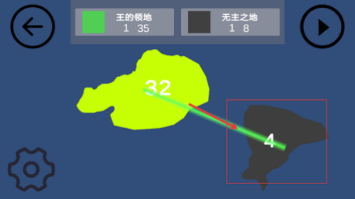 1、初始领地建设阶段,玩家拥有一个绿色起始地块,其上数字代表当前可用兵力,点击该地块即可选择“增援”以积累更多作战单位。