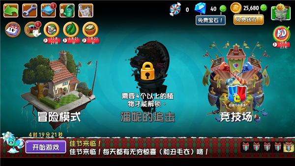 植物大战僵尸2中文无限钻石(PvZ 2汉化+商补)为玩家们解锁了免费的金币钻石,让你可以轻松选择需要的植物、道具、皮肤等等,而且这个版本是中文的,所以大家玩起来也没有任何障碍。游戏提供基础的三种玩法模式,你可以自由开始挑战,右上角的商城中会显示免费的商品,直接点击即可购买。
