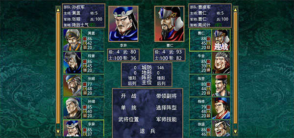首先进入战前准备,交战双方的人马会同时出现在屏幕两边,交战规则采用淘汰制,每次各派一名将领出战。胜利的武将可再次出战,而败阵或平手的武将便无法再出阵。直到一方不能再派出武将为止。而在此可对武将的出战顺序、阵形的选择、武将在阵形中的位置以及军师指令进行调配。当然,如果看出大事不好,也可选择退兵——脚底抹油,开溜。但要记住:若连续退兵三次而未能进城休息,第四次退兵时将会全军被俘。