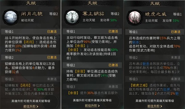 2、蔡文姬发动天赋【塞上胡笳】,为追击格上的单位施加【余音】效果,使吕布在追击时有概率额外发动一次追击技能,大幅提高其出手频率。