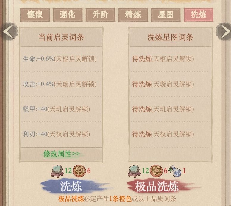 一个星图点满5星后可以启灵,启灵给词条属性,词条可以选类型,但品质要洗,每多一级星图多一个词条位置。