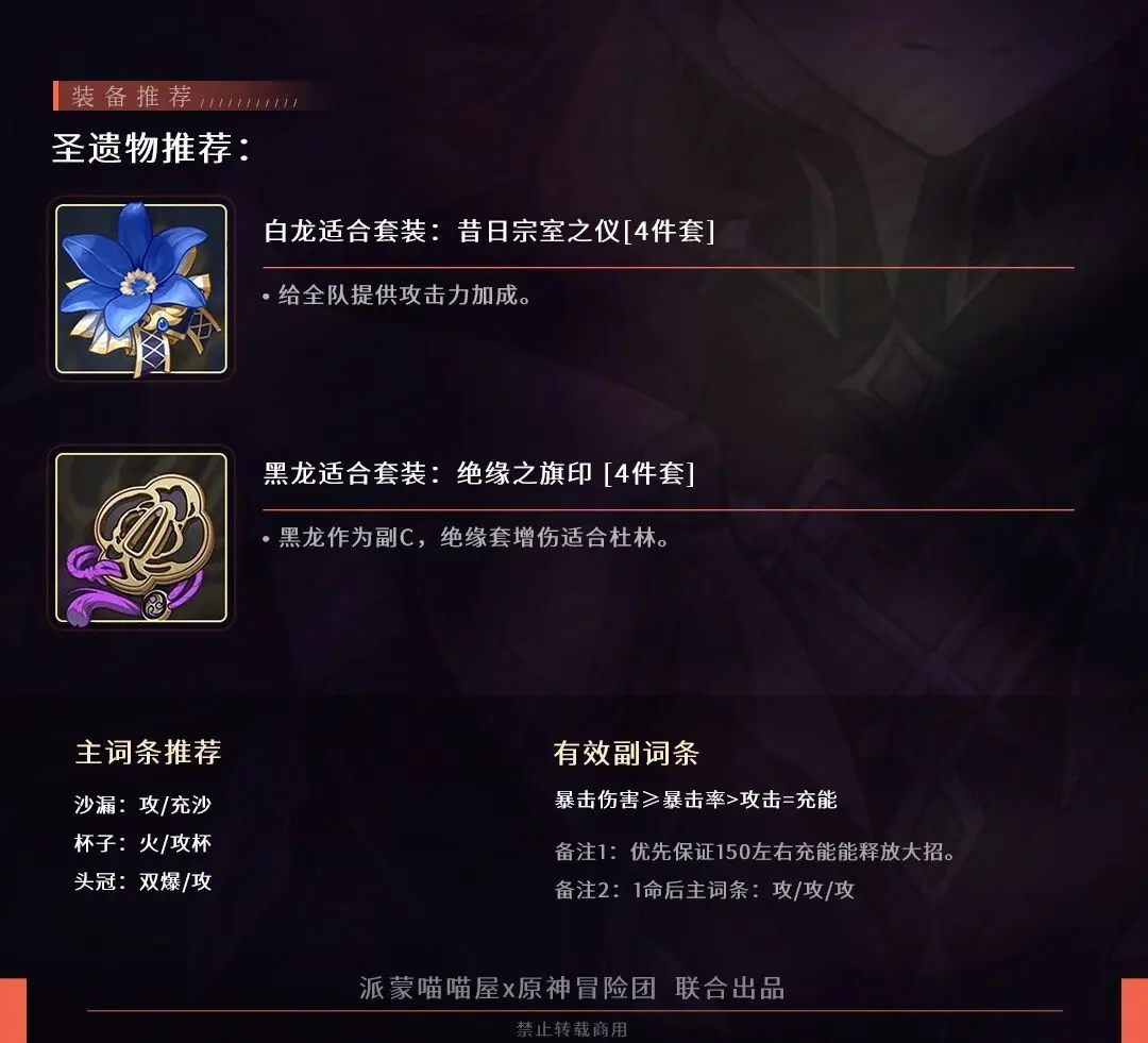 效果:释放元素爆发后20秒内提升10次白龙或黑龙造成的伤害,每100点攻击提升3%,最多75%(2500攻击力)