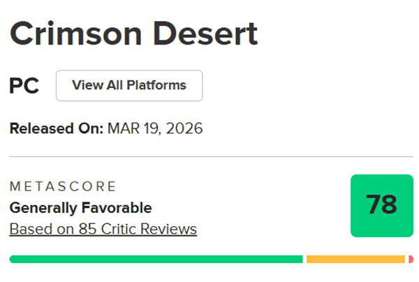 《红色沙漠》媒体评分现已正式解禁。截至目前,Metacritic共收录94家媒体评测,游戏均分为78分,整体表现中规中矩。不过,随着更多评测出炉,作品口碑呈现明显分化趋势。